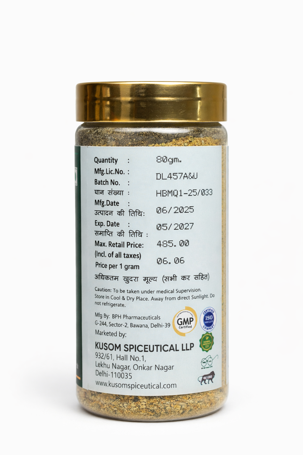 - Herbs: Moringa leaves, Ashwagandha, Kulanjan, Nettle leaf, Shallaki, Hadjod, Babool gaund, Laksha
